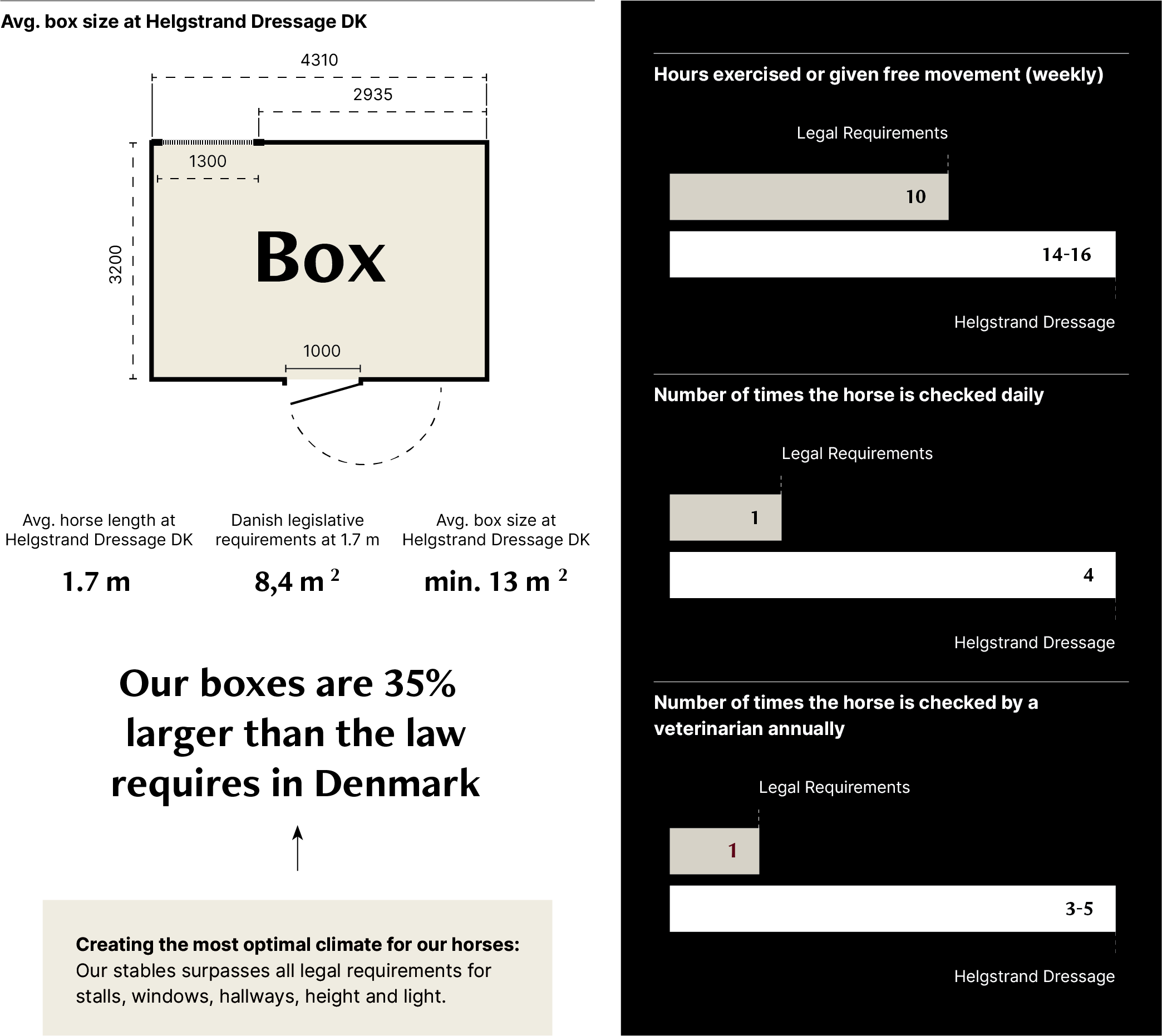 We go to great lengths to ensure first-class facilities for our horses – both in the arena and in the stables. Our boxes are approximately 35 percent larger than required by law, and we offer spacious and comfortable living areas for all our horses. Additionally, we provide everything from thick layers of high-quality bedding, plenty of natural light, to excellent ventilation systems; every detail is designed to create a comfortable and healthy environment for our horses.