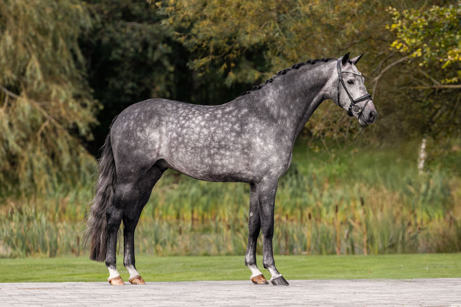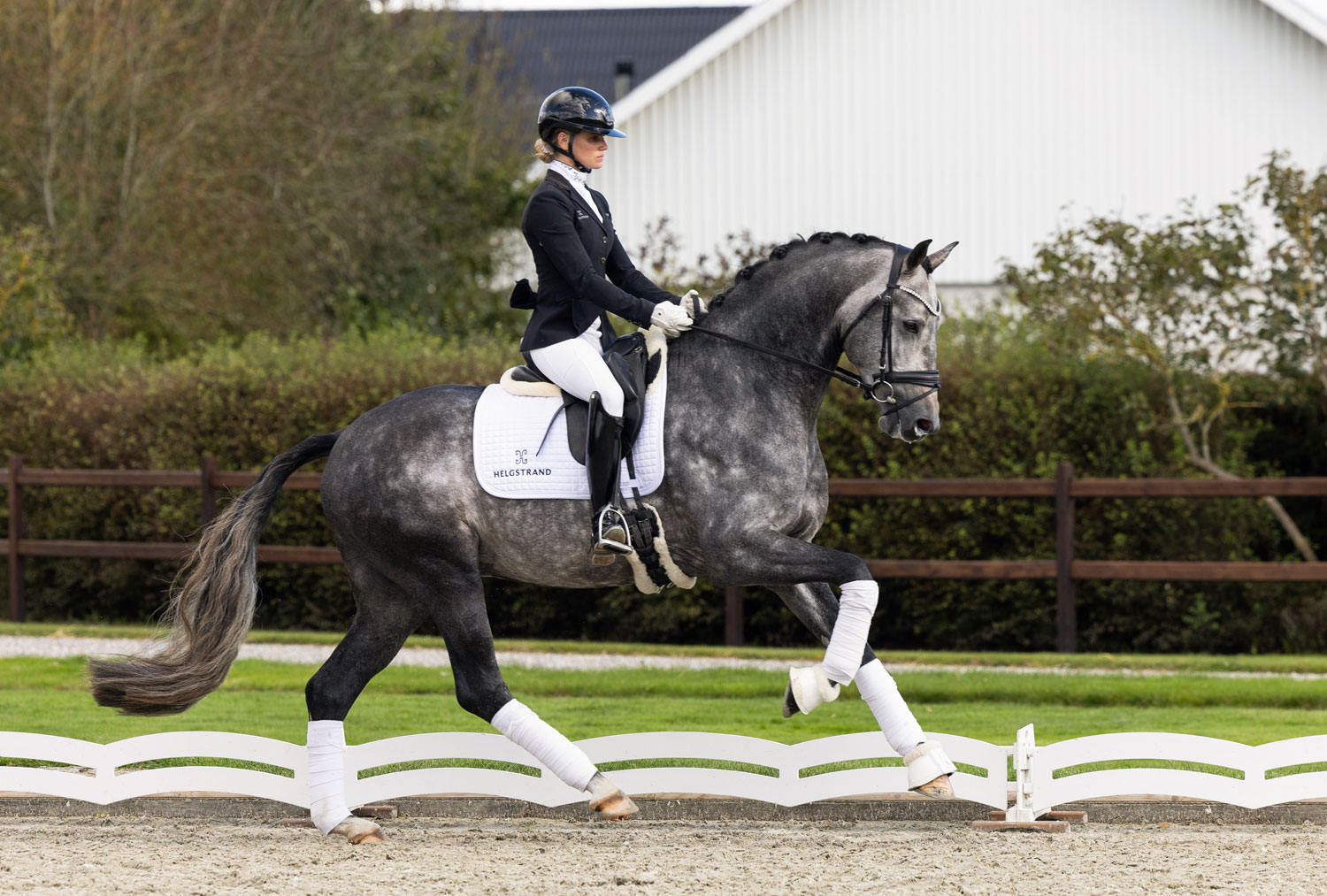 Proud James, who was awarded a premium at his licensing in Denmark, also completed his stallion performance test in the Netherlands with a sensational score of 91 points (out of a possible 100 points) and well ahead of the competition. "This gray stallion has incredible balance, a very good movement technique and a very good, committed hind leg. He has a tremendous uphill tendency and a fantastic character," said examiner Bert Rutten, enthusiastically summarizing the jury's impressions. Our Proud James received a 9.0 for walk, trot, canter, rideability and potential, and a dream score of 10 for self-carriage and suppleness. Proud James was finally graded in Danish Warmblood in 2024 with the following impressive comments from the judges: "Proud James is a harmonious and appealing stallion of exceptionally good type and with a good stallion format. He has a long, sloping shoulder and a well-shaped, slightly short but very functional and supple topline. He has a rhythmic, spacious, and energetic walk. The trot is supple, powerful, with good shoulder freedom and action in the hind legs. The canter is incredibly well-balanced, spacious, with great shoulder freedom and good natural carriage."
